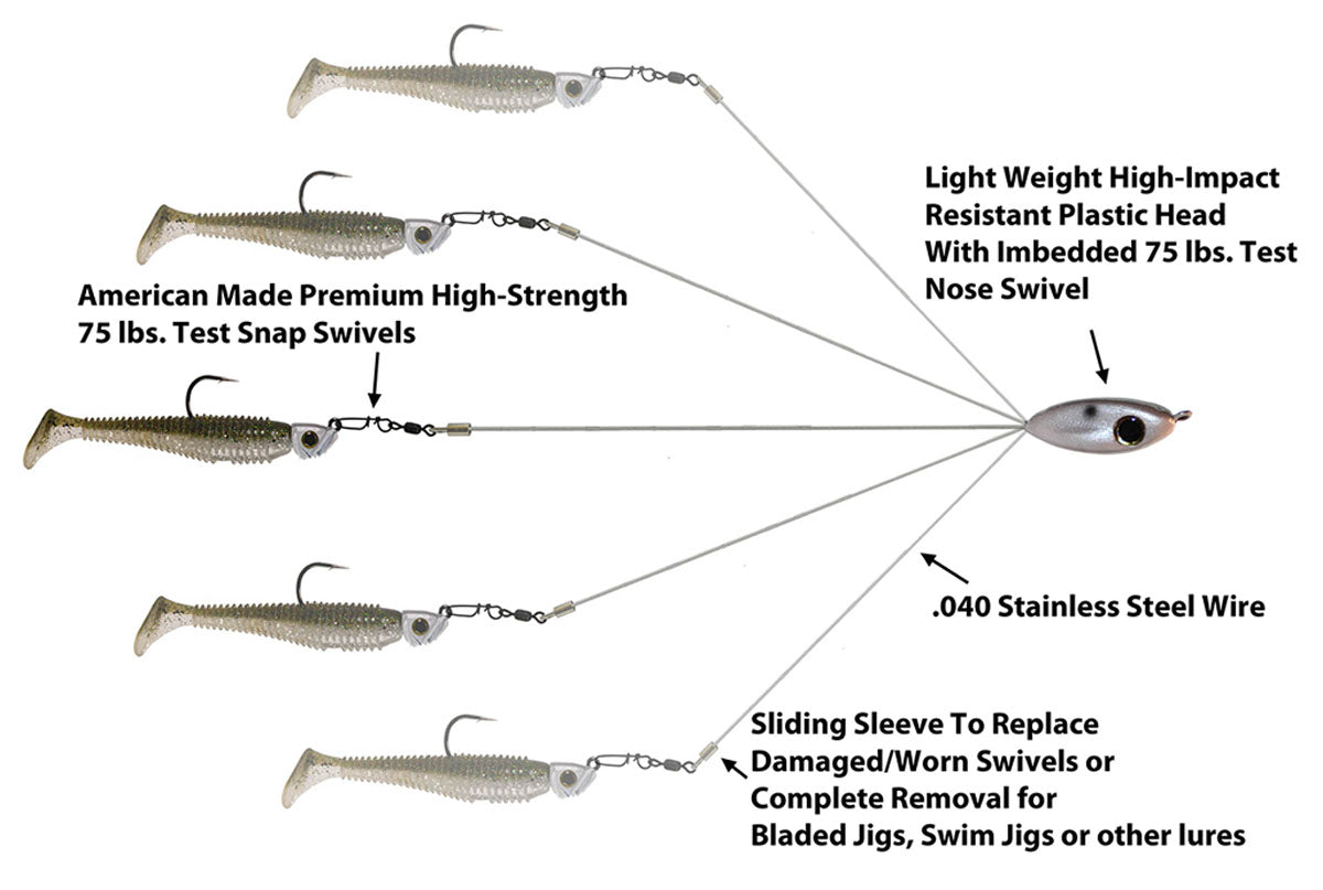 Now made with super strong Inviz-Wire to maximize the longevity of the rig. This brown wire outlasts bright stainless and provides a low visibility offering for following bass. This rig includes a sliding sleeve feature to replace any damaged snap swivels or quickly change out jig head size. The sleeve can be crimped easily if added retention is desired.