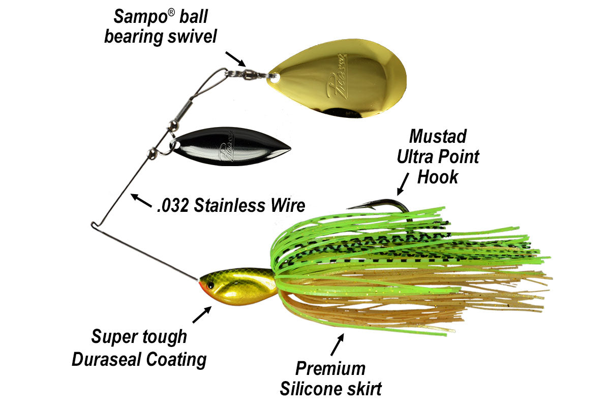 Picasso Willow/Indiana Light wire Spinnerbaits use .032 diameter stainless wire to create a unique elliptical movement of the upper arm on retrieve. This flexible light wire allows the bait to be "collapsed" during rapid strikes to insure proper hook set. Picasso uses a grommet center skirt to insure the skirt will not pull down and provide the ultimate in action.
