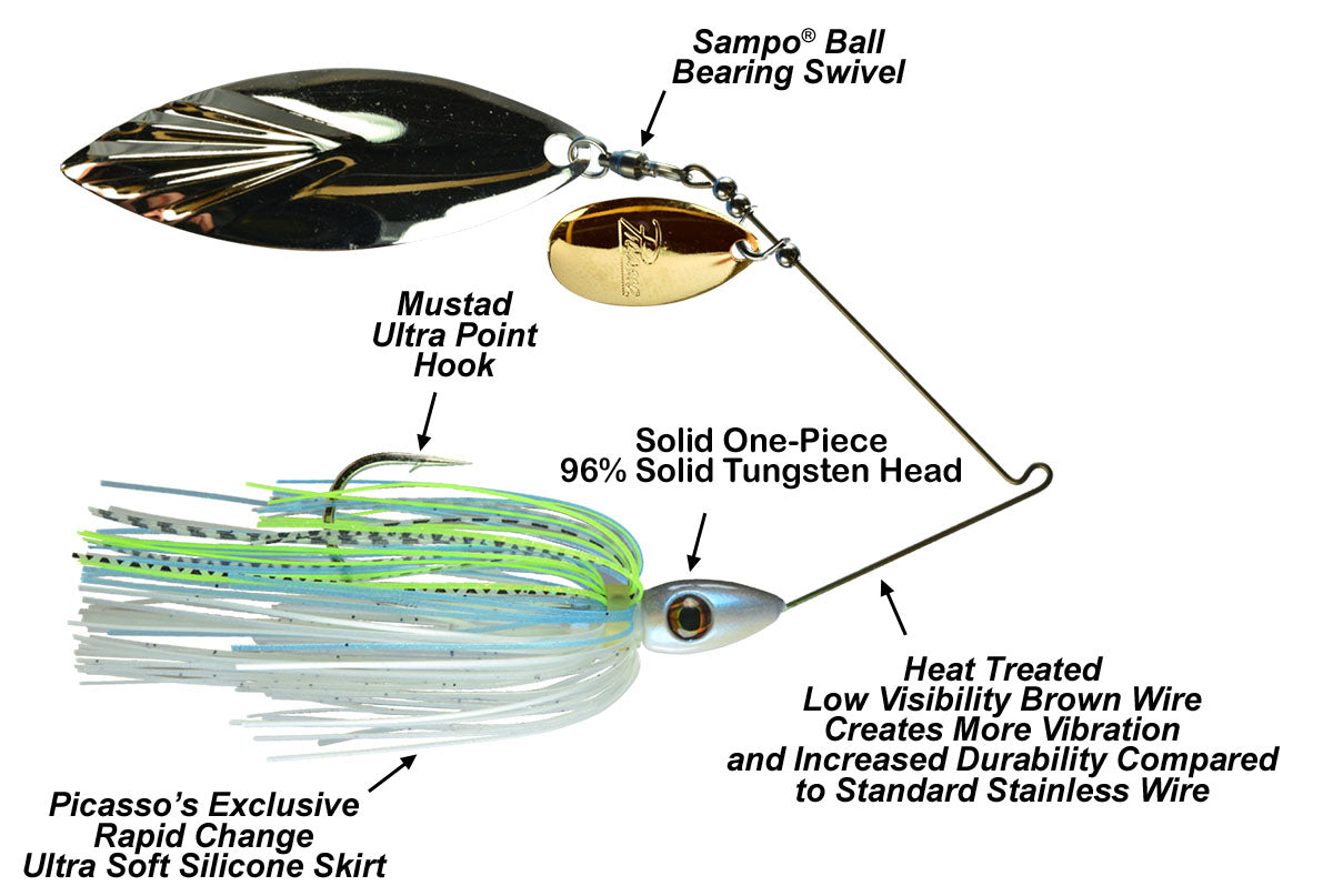 INVIZ R Wire Spinnerbait - Features a heat treated .035 brown colored super wire which is much less visible to fish. The stealthy, natural appearance draws attention to the skirt and blades without the distraction of wire flash which is especially important in clear water. This Medium gauge (.035) wire provides a great balance between strength, vibration and stealth. Hand tuned to run perfectly right out of the package.